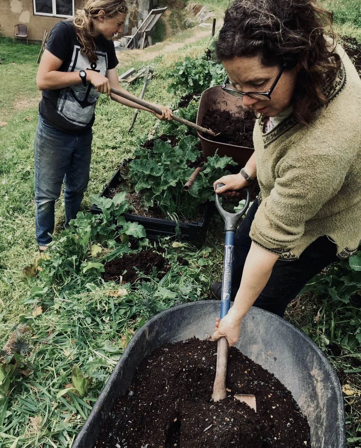 Mon and son prepping garden beds.